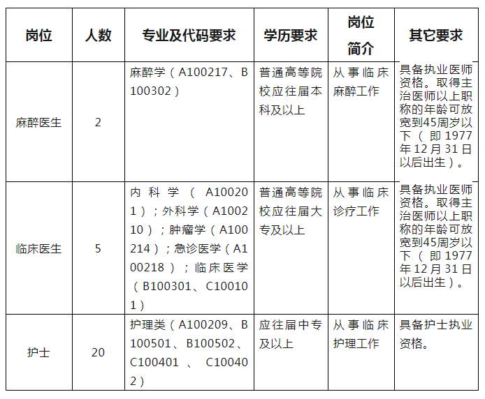 7.热爱卫生健康事业,年龄要求为40周岁以下(即1983年12月31日以后出生),其中:麻醉医生、临床医生岗位取得主治医师以上资格的报考人员年龄放宽到45周岁以下(即1977年12月31日以后出生);